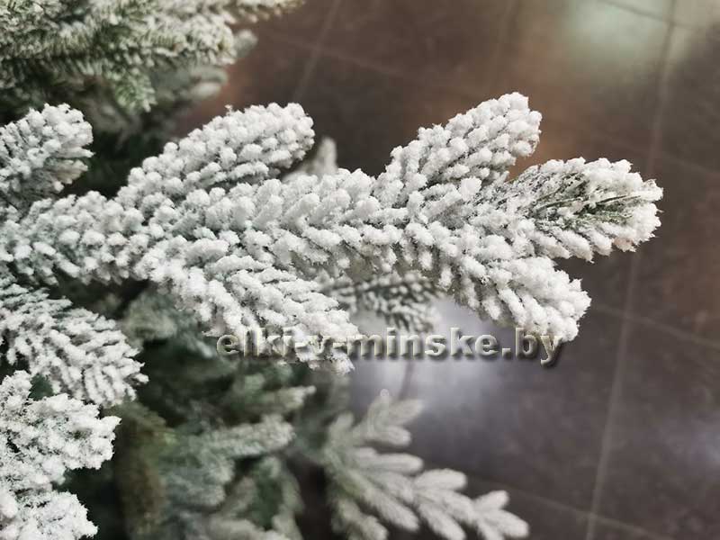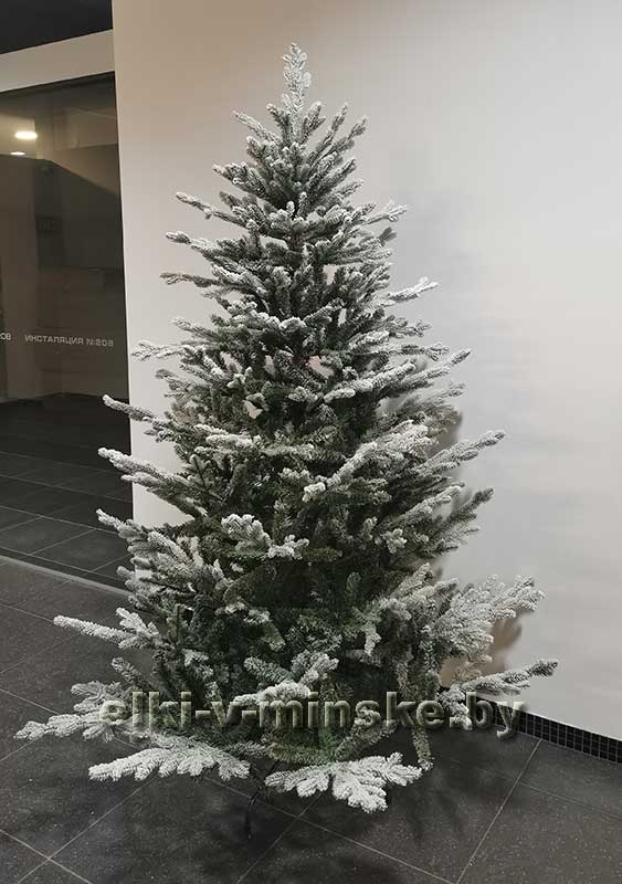 Ель усыпана качественным искусственным снегом. Такой снег не осыпается, не желтеет и не воняет.