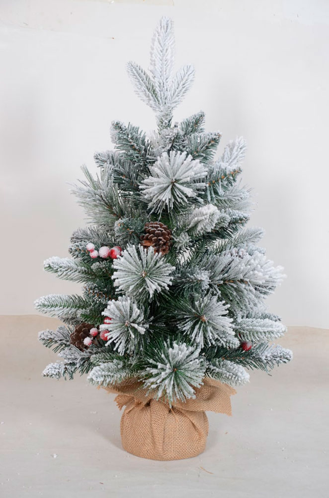 Искусственный снег, покрывающий веточки, придает елочке зимнюю атмосферу, а декоративная подставка, выполненная в виде мешковины, добавляет еще больше очарования. Эта елочка идеально подойдет для стола или комода и будет прекрасным дополнением к вашей новогодней декорации.