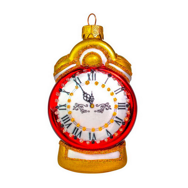 Елочная игрушка стеклянная декорированная Будильник красный