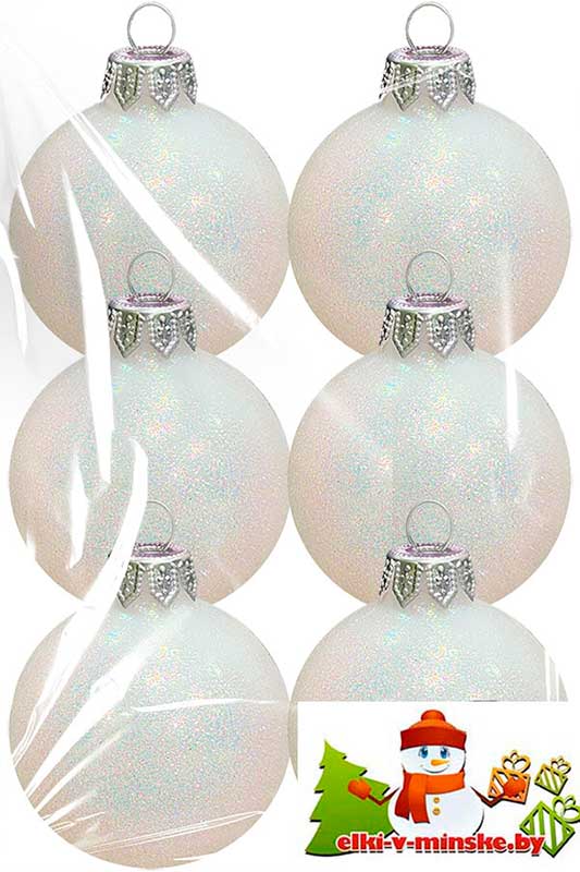 Набор пластиковых шаров диаметром 6,5см. В наборе: 6 шаров белого цвета, покрыты ровным блестящим глиттером. Материал: пластик.